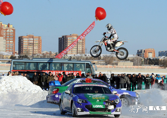 1月12日,來(lái)自大連的“亞洲新飛人”、柯受良弟子謝雨均駕駛一輛自重1.6噸的賽車,在零下四十度極寒氣候條件下,從中俄邊境城市——黑龍江省黑河市的大黑河島起飛,經(jīng)過(guò)300米的跑道加速,飛越中國(guó)境內(nèi)寬度約40米的黑龍江江面。由于目前黑龍江已經(jīng)完全封凍,所以這次行動(dòng)的主題命名為“飛越冰河”。