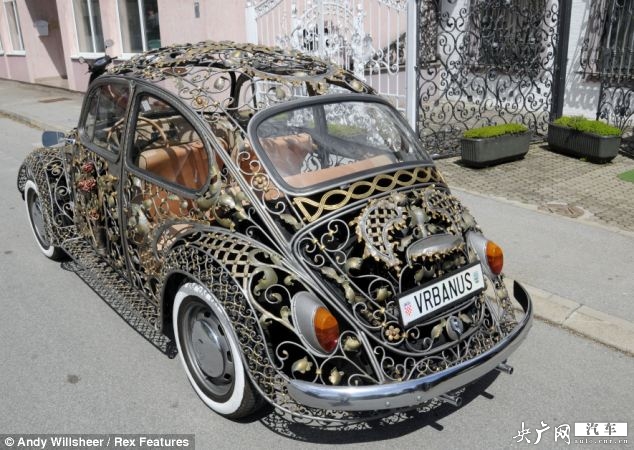 克羅地亞一家鐵藝門制造商近日打造出一輛獨一無二的甲殼蟲經典車型。該車回歸古典風格,整個車身由獨特設計的熟鐵打造而成,外表雕刻成精美的鏤空花樣。該車的設計用時4個月,由3個工匠花費3000個工時手工打造,包括外觀24克拉金葉的設計和手工縫制的皮制內飾。車內的每個組成部分都是定做的。