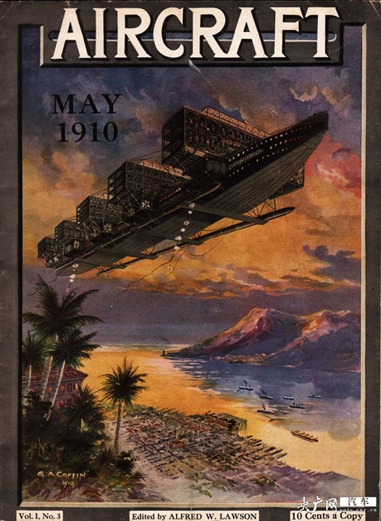 1910年5月期的《飛行器》雜志封面,展示了一種具有未來派色彩的飛行器。《飛行器》雜志在紐約刊印。