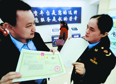1日早上,在豐臺工商分局注冊大廳,華研環科(北京)科技有限公司的相關負責人從國家市場監督管理總局登記注冊局局長熊茂平手中接過了一張特殊的營業執照,這是本市首份新版營業執照,標志著新版營業執照在京正式啟用。