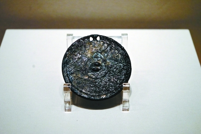 另外一件重要的展品是一面七星紋銅鏡,這也是中國迄今發現的最早的一面銅鏡,銅鏡邊緣和鏡鈕周圍飾有凸弦紋,弦紋之間采用陽鑄雙關構圖,飾七角星紋,角與角之間有斜線紋,構圖巧妙。銅鏡中間有圓形拱鈕,銹蝕較重,邊緣有兩孔。