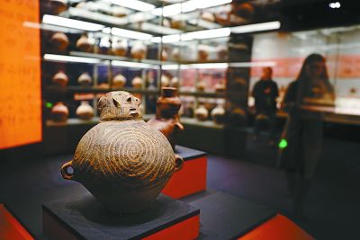 展覽中,一件新石器時期馬家窯類型的雙人抬物紋彩陶盆引人注目,這件彩陶盆距今已有約5000年的歷史了,泥質為紅陶,內彩主題為四組相向而立的人物,背部彎曲、雙臂前伸共抬一圓形重物,四組紋飾之間以橫豎條紋填充,人物和橫線之間用豎線間隔開,下面是平行紋,口沿飾三角紋和斜線條紋,盆外彩繪有平行帶紋和單鉤紋。據策展專家介紹,這個彩陶盆反映了中國最早的祭祀場景。