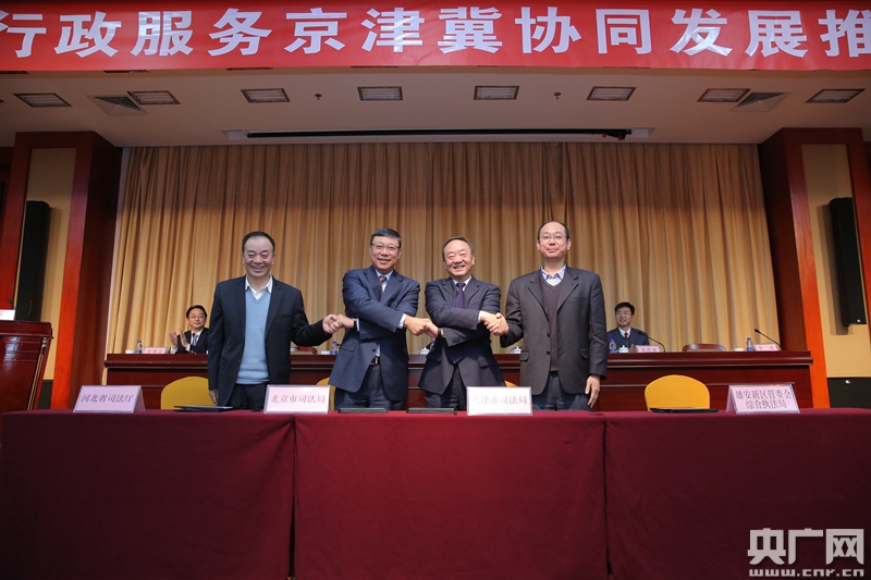 據悉,自2015年9月簽署《司法行政工作服務京津冀協同發展框架協議》,以及涉及法治宣傳、律師代理、公證、監獄工作等4方面的“1+4”合作協議,正式拉開三地服務京津冀協同發展的序幕,開啟了三地共建共享、攜手并進的新征程。2017年,三地又共同簽署《京津冀戒毒工作協同發展合作協議》,形成司法行政服務京津冀協同發展“1+9”的整體工作框架,實現對司法行政主要業務工作的全覆蓋,為最大限度地統籌三地司法行政資源,凝聚三地司法行政力量,全力服務京津冀協同發展奠定堅實基礎。