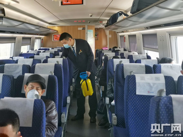 列車乘務(wù)員為列車消毒(央廣網(wǎng)發(fā) 通訊員唐娟 攝)