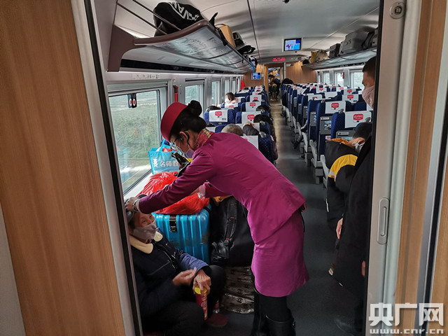 列車乘務(wù)員服務(wù)老年旅客(央廣網(wǎng)發(fā) 通訊員唐娟 攝)