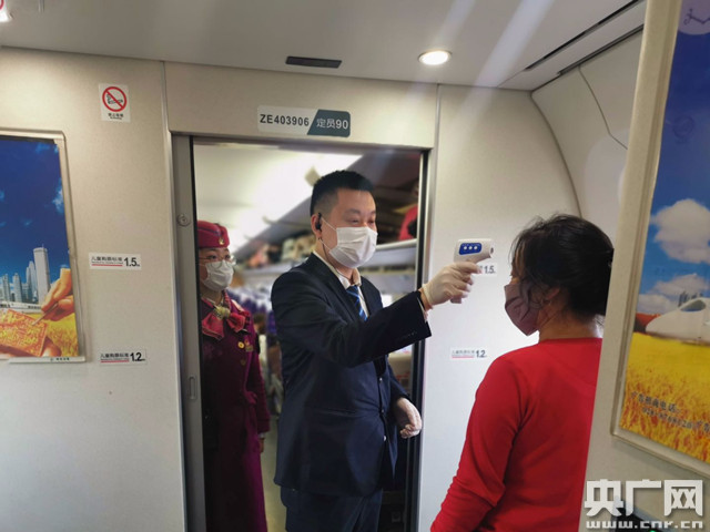 列車乘務(wù)員為乘客測(cè)量體溫(央廣網(wǎng)發(fā) 通訊員唐娟 攝)
