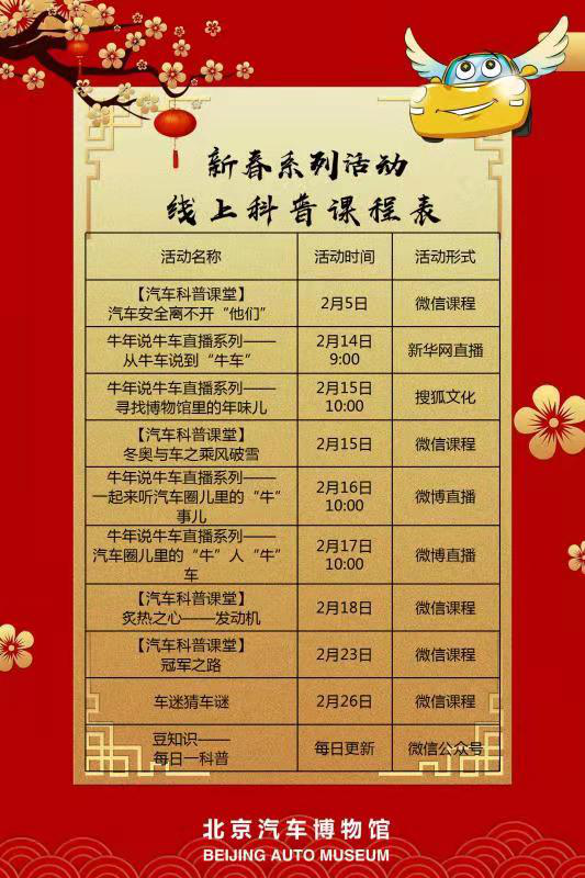 據北京汽車博物館相關負責人介紹,初三至初六以“牛年說牛車”為主題,每天一場直播講述汽車圈兒里的“牛”車、牛人、牛事兒。初三,科普老師講帶領大家從古代的牛車講到現在的“!避;初四,汽車博物館工作人員將帶領大家尋找汽博館里的年味兒,逛一逛博物館里的新春文創節;初五,講解員以角色扮演的方式為大家帶來一場情景式講解;初六,以新年特展“那些年,在路上”為主線帶大家看一看各個年代的經典車型,聊一聊汽車圈兒里的“!比恕芭!笔聝。