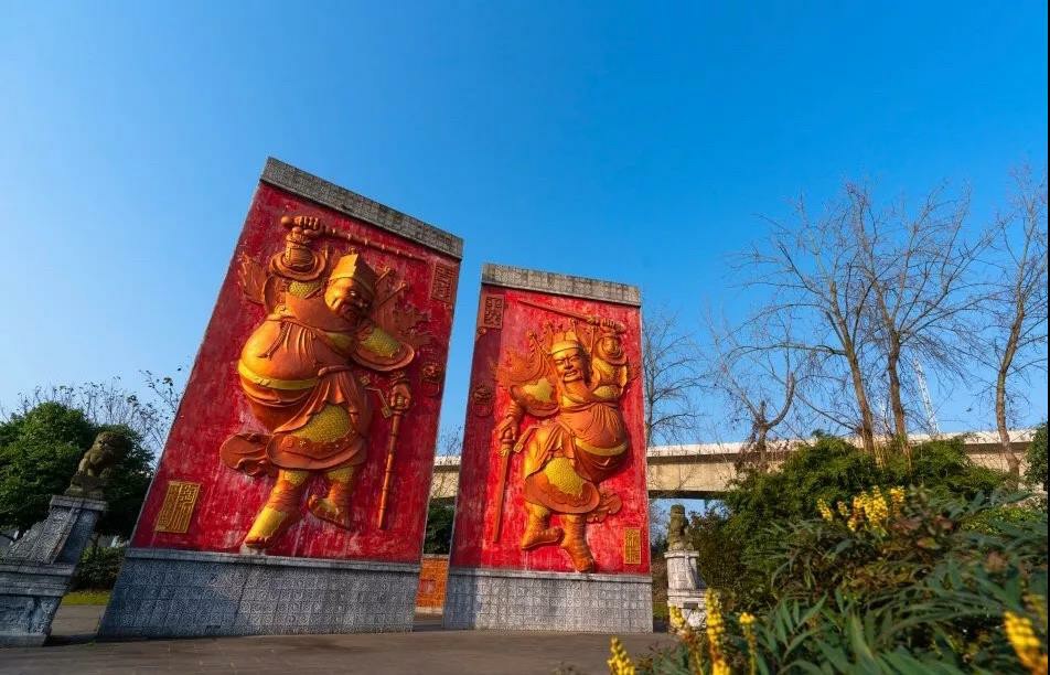 踏入綿竹年畫村,在萬福廣場上看到一對威風凜凜的立式陶版門神,紅紅火火的底色和金色的人物形象,讓人頓時感受到一股濃濃的年味兒。