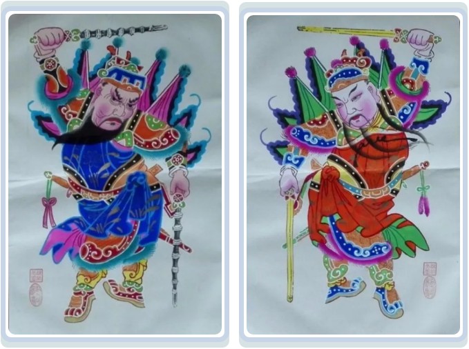 年畫中,大門一般會貼秦瓊、尉遲恭等武門神,傳說可以驅妖降魔;院內堂屋會貼天官和狀元等文門神,有迎祥祈福、加官晉爵之意;寢室門上一般多以童子和仕女題材為主,內容多為抱瓶、采蓮、佛手之類,表示子孫繁衍、福壽無邊之意。