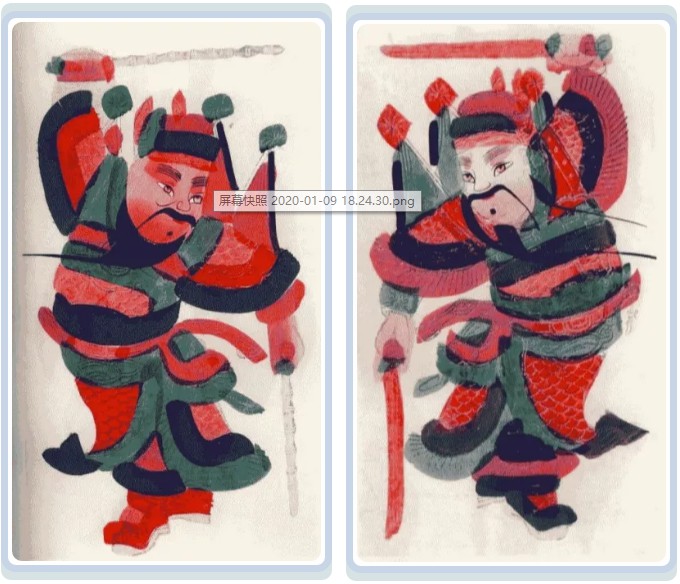 這對門神取材于清代綿竹年畫《雙揚鞭》,畫中門神秦瓊和尉遲恭也是中國民間最具知名度的門神了。他們手持雙鞭、雙锏,因而這類門神都被綿竹畫師稱為“雙揚鞭”。