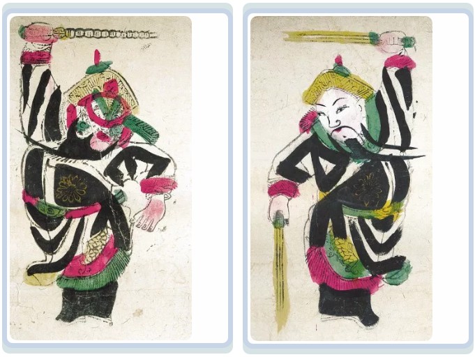 綿竹地區還匯集三教,張道陵曾在這里創立五斗米教,藏傳佛教名寺祥符寺坐落在這里,東漢“二十四孝”之一“涌泉躍鯉”的故事發生在這里,神仙傳說系統龐雜,因而表現在年畫中,門神形式最為多樣而富有變化,在內容上還具有教化育人的作用。