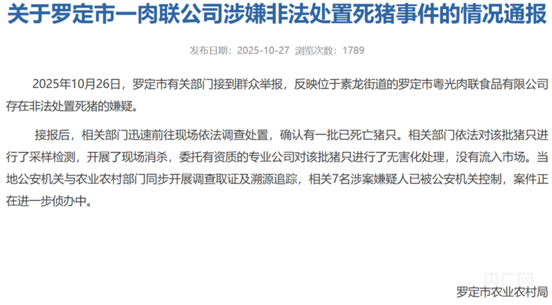 廣東羅定一企業非法處置死豬 官方通報:沒有流入市場,7名涉案嫌疑人已被控制