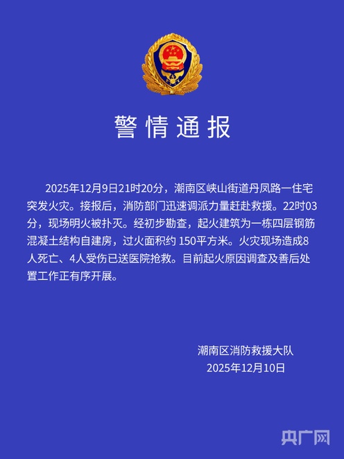 央廣網汕頭12月10日消息(記者鄭少純)據廣東省汕頭市潮南區消防救援大隊10日凌晨發布的警情通報,9日21時20分,潮南區峽山街道丹鳳路一住宅突發火災,造成8人死亡。