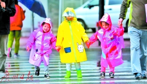 三個小朋友放學回家時穿上了卡通雨衣,快樂地牽著手過馬路。廣報記者邵權達攝