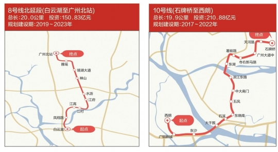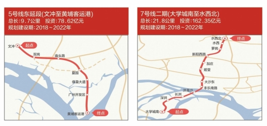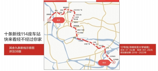 批復文件提到,2017年至2023年,廣州將建設3號線東延、5號線東延、7號線二期、8號線北延、10號線、12號線、13號線二期、14號線二期、18號線和22號線共10個項目,總長度258.1公里。目前,廣州地鐵通車里程為309公里(含廣佛線和APM ),共11條線路。在建的線路加上最新獲批的線路,預計到2023年,廣州將形成18條線路、總長792公里的軌道交通網。