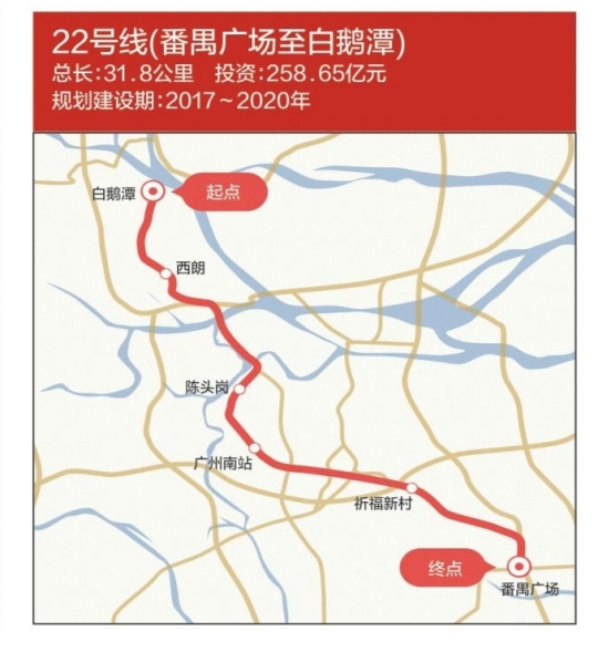 22號線定位為南站快線(示意圖詳見08版),沿線經過南沙區、番禺區和荔灣區,自南向北依次連接南沙新區萬頃沙樞紐、番禺區的番禺廣場、廣州南站地區和荔灣區的白鵝潭地區。線路土建工程起于番禺廣場(與18號線共址),止于白鵝潭。
