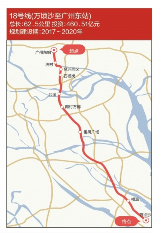 18號線定位為南沙快線(示意圖詳見08版),沿線經過南沙區、番禺區、海珠區和天河區,自南向北依次連接南沙新區萬頃沙樞紐、番禺區的番禺廣場、海珠區的琶洲片區以及天河區的珠江新城和廣州東站。起點為萬頃沙,終點為廣州東站。