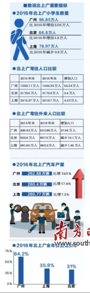 據南方日報報道,日前,廣州市統計局、國家統計局廣州調查隊公布了《2016年廣州市國民經濟和社會發展統計公報》(以下簡稱“公報”)。對比北京、上海已經發布的統計公報,廣州在小學生總量和增量、汽車產量和增長率、保費收入增長率等指標中,均位列三座一線城市第一名。