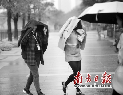 6日的廣州陰雨綿綿,花城廣場,用衣服遮頭的兩名女子在雨中前行。記者肖雄攝