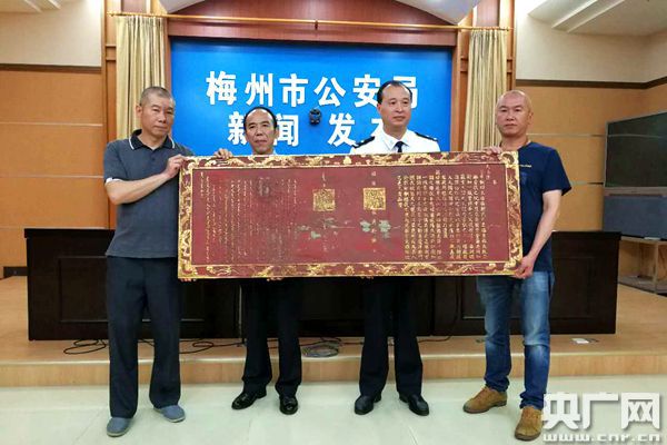 央廣網梅州4月11日消息(記者官文清 劉杰)今日(11日)上午,梅州市公安局召開新聞發布會,通報了梅州市蘭軒葉氏宗祠清代圣旨匾額(經鑒定為三級文物)被盜案偵破情況。