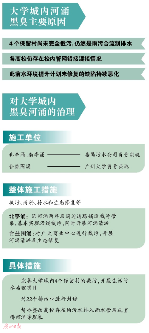 番禺區有關負責人表示,針對大學城內3條黑臭河涌,采用截污、清淤、補水和生態修復等多種措施,開展黑臭水體治理項目。其中北亭涌、南亭大社涌由番禺污水公司負責實施,合益圍涌由廣州大學實施。3宗項目均在2016年8月啟動,目前正在開展前期工作。
