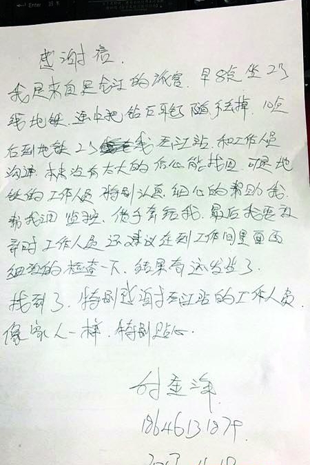 在經(jīng)歷了整整兩個(gè)小時(shí)的翻找后,匡小娟與付小姐終于發(fā)現(xiàn)了那包裹著鉆石耳釘?shù)募埥恚@石耳釘失而復(fù)得,付小姐的歡喜溢于言表,“能夠找回真是奇跡,地鐵工作人員像家人一樣,特別貼心”。