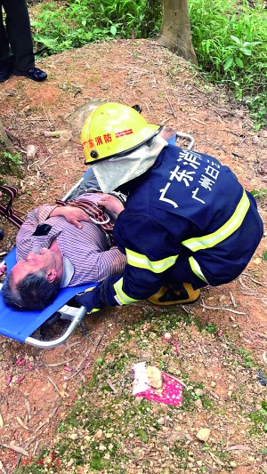 現場消防員將老人抬上擔架,用腰帶與繩索固定好,經過將近1個多小時的救援,將老人安全抬到山腳,并移交當地派出所與120急救人員處理。