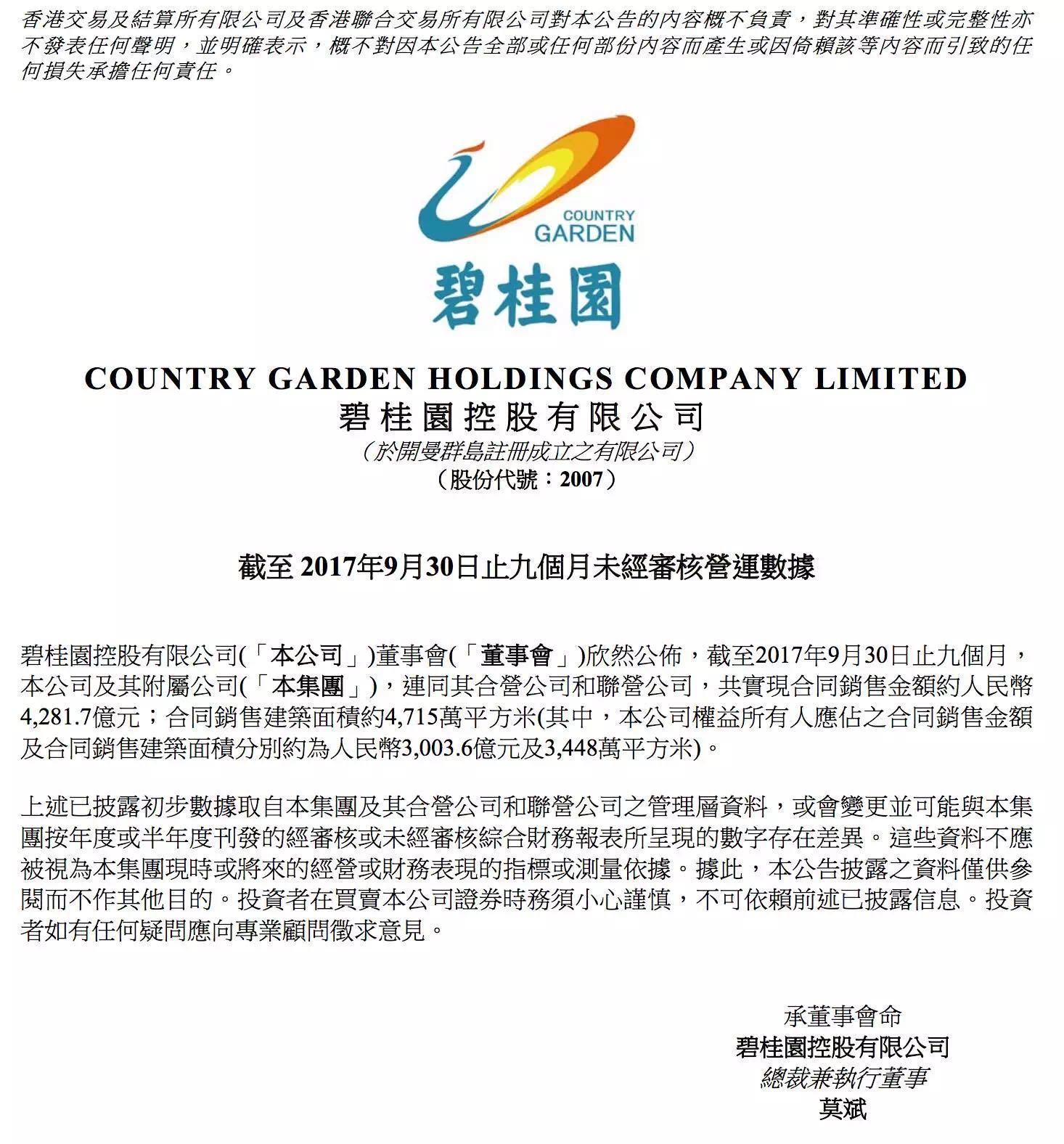 央廣網(wǎng)佛山10月12日消息 10月12日,碧桂園發(fā)布公告,截至2017年9月30日止,公司實現(xiàn)合同銷售金額約人民幣4281.7億元,同比增長89.8%;合同銷售建筑面積約4715萬平方米,同比增長69.6%。