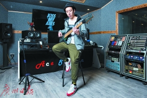 黑Vans禮帽,灰運動外套,胸前印著“移動術(shù)”三個字的T恤,腳下一雙白耐克氣墊跑鞋,李喆坐在錄音棚的高腳凳上,一把熒光綠色的貝斯在手上閃耀,說話時不時夾雜著標準的英文單詞。
