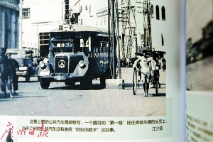 一張車頭上掛有“第一路”牌的汽車引起了江少堅的關注,因為車身上有奔馳的標志,他印象中廣州好像沒有進口德國的公交汽車,且該照片車身被其他物品擋住,難以辨認街景和車身設計。