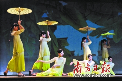 熱鬧、歡騰的舞蹈《獅舞嶺南》拉開了演出的序幕;歌曲《萬水千山總是情》《母親》勾起了僑胞濃濃的思鄉之情;舞蹈《桃色滿園》《雨打芭蕉》(見右圖)展現了溫婉、靈動的中國美;川劇變臉表演出神入化;雜技肩上芭蕾《蝶戀》將浪漫與驚險融為一體……精彩的演出不時引發掌聲和喝彩。