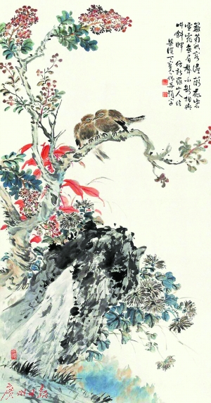 無論善于鳴唱,還是善于打斗,都只是畫眉雄鳥天性的一部分。除此之外,畫眉也有溫情的一面。自然界的畫眉,當雌雄擇偶配對以后,便以“小家庭”為單位,筑巢定居,哺育雛鳥。一些畫家對此也深有感觸,力圖表現畫眉鳥溫情的一面。如近代畫家丁寶書曾繪《籬菊畫眉》立軸,畫中一對畫眉并排立于樹枝上,互相依偎,親密無間。清代的《牡丹畫眉》同樣也表現了畫眉溫情的一面,一只畫眉欲啄地上的小蟲,另一只抬頭望著它,毫無爭搶之意。