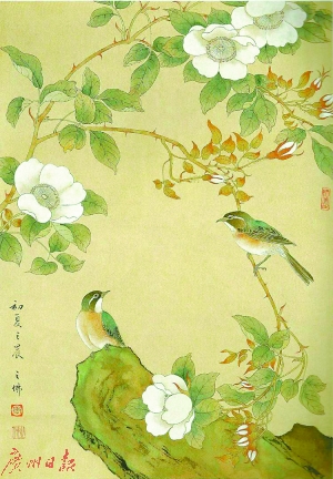 近代著名花鳥畫家陳之佛繪有《初夏之晨》,畫面上潔白的野薔薇盛放,一對畫眉鳥停歇在樹枝和石上,在芬芳晴朗的夏日清晨中怡然自得。花、樹、石、鳥均以工筆寫出,構圖嚴謹,設色雅麗,淡而雋永,清新瀟灑,給人以雅靜、柔和之美感。