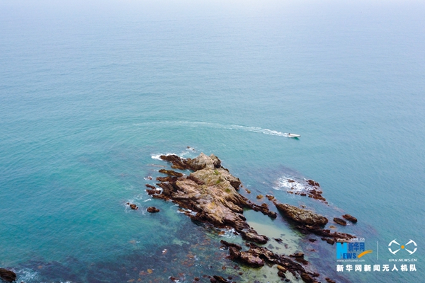 蔚藍的海,海浪拍打著礁石,船只穿過,好一幅美麗的畫卷。新華網發(陳楷攝)