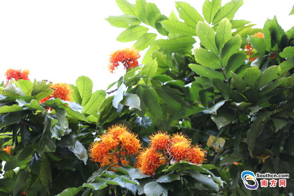 據南方網報道,廣州近日多個地方無憂樹陸續開花,團團艷麗的火焰花成為春天羊城的一道風景。廣東省生態學會介紹,無憂樹,蘇木科,無憂花屬,常綠喬木。別名為無憂花,火焰花。無憂樹開花時,一團團、一簇簇金黃色的花團如火炬燃燒,令人眼前一亮。無憂樹是佛教的圣樹、神樹。從現在起至本月中旬,是廣州無憂樹的盛花期。