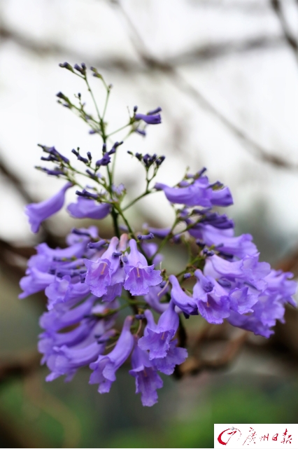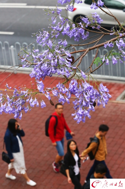 據廣州日報報道:記者在黃埔大道看到,不少行人都被路兩旁樹梢上一團團淡紫色的“云朵”吸引,紛紛駐足拍照。淡紫色的花朵像一簇簇小鈴鐺掛在樹冠上,配上與含羞草相似的葉子,格外令人賞心悅目。“這兩年很多公眾號都做藍花楹賞花指南,每逢開花,很多人都會過來拍照,”暨南大學大三的吳同學說。