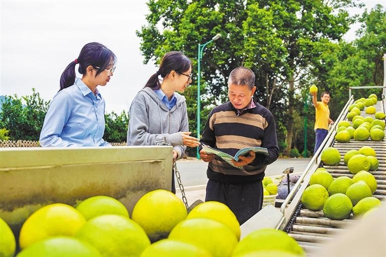 農(nóng)行梅州分行員工逐戶走訪當(dāng)?shù)罔洲r(nóng),為柚子種植戶介紹農(nóng)行特色產(chǎn)品