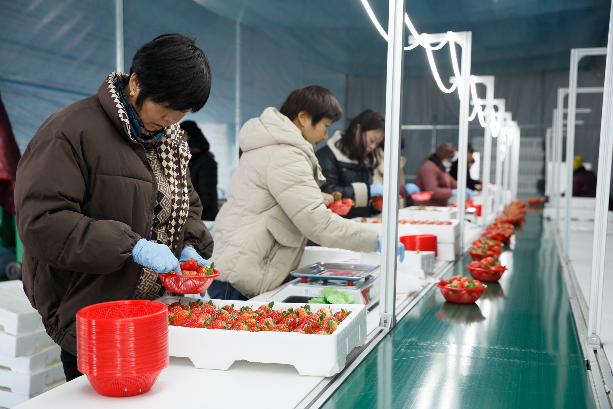 分揀、裝箱、打包……在腰山鎮才良村沃野草莓現代化農業園區的一處分揀中心,工人們忙著將剛采摘的草莓進行打包,準備發往合作的各大商超。“我種植的4個草莓大棚現在都進入了采摘期,今天紅顏99草莓的收購價是28元一斤。”農戶高紅芳說。