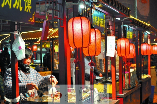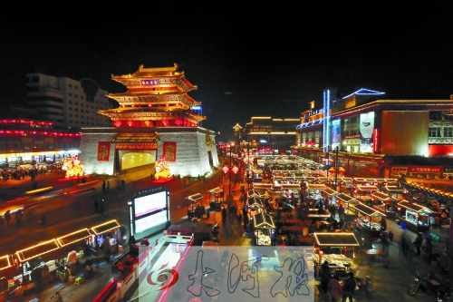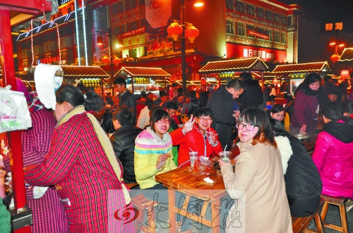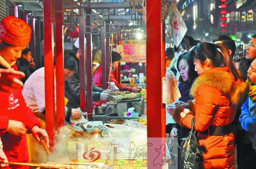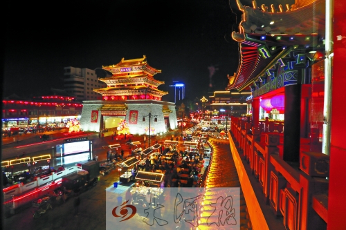 2013年12月28日晚,在剛剛復(fù)建竣工的鼓樓四周,大大小小的紅燈籠,搖曳在高脊挑檐、青磚綠瓦間,搖蕩在頭上蓋了個(gè)“瓦當(dāng)帽”透著古色的餐車上……粗聲大嗓的叫賣,烹炒煎炸的香味兒,融成一種特有的熟悉味道……鼓樓夜市回歸。