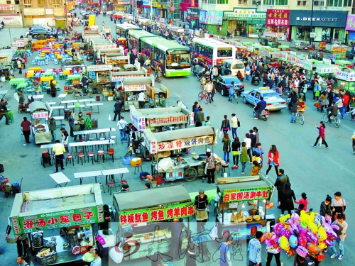 鼓樓廣場的格局已完全不同,廣場南北兩條街道為步行街,東西兩條街道改為由西向東的單行道(公交車除外)。鼓樓城門洞下的直道為機(jī)動(dòng)車道,左右兩邊的環(huán)道為公交車道。夜市攤位分布在環(huán)道四周大小不等4個(gè)區(qū)域的人行道上,車道與攤位有了明顯的界線,交通秩序大為改觀。