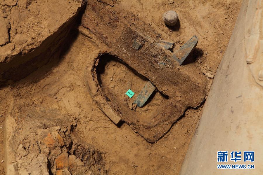 央廣網河南分網消息 據新華網報道:2月26日,記者從秦始皇帝陵博物院獲悉,考古專家在對秦兵馬俑一號坑進行第三次考古發掘過程中,在靠近坑壁北沿的過洞中清理發現了一件弓弩,其最易損毀的弓弦清晰可見,整體保存較完整,這在秦兵馬俑考古史上尚屬首次。(新華社發)