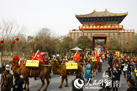 央廣網河南分網消息 據人民網報道:3月8日,百峰駱駝走進國家5A級景區——開封清明上河園,通過此次活動,清明上河園景區向人們展示了“八朝古都”開封悠久歷史文化和北宋時期輝煌的茶路文化,讓游客真切感受“一朝步入畫卷、一日夢回千年”的時光倒流之感。