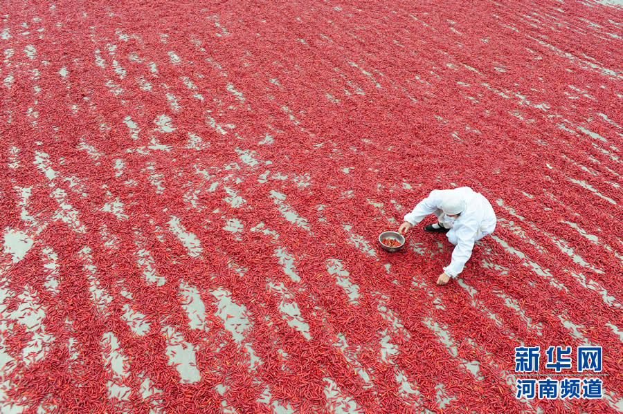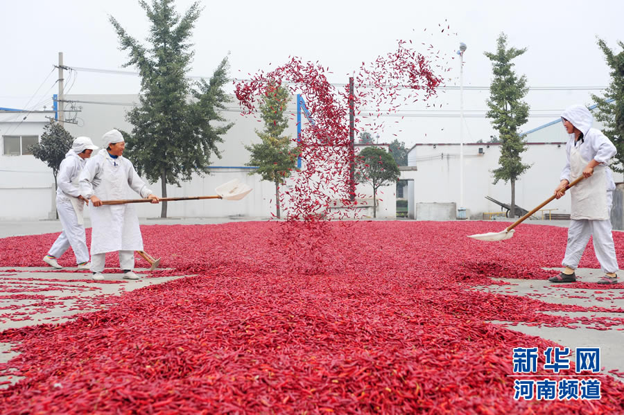 2010年以來,河南省項城市發展特色辣椒種植,推行“公司+基地+農戶”的運作模式,種植面積已達1萬余畝,每年為農民帶來2600多萬元收入。辣椒深加工產品遠銷巴西、南非、德國等國家,昔日農家餐桌上的“一碟小菜”成為農民增收致富的紅色大產業。 新華社發(馮大鵬 攝)