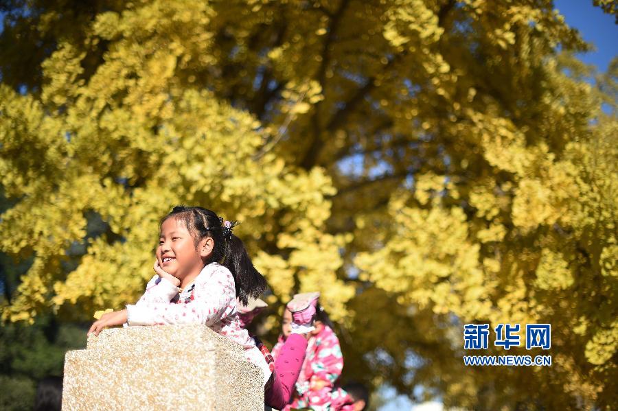 11月1日,一名小朋友在清華大學校園內金黃的銀杏樹下留影。晚秋時節,北京清華大學校園內清華路旁的銀杏樹葉一片金黃,在陽光下飽滿明亮,猶如一幅金色畫卷。 新華社記者 陳曄華 攝