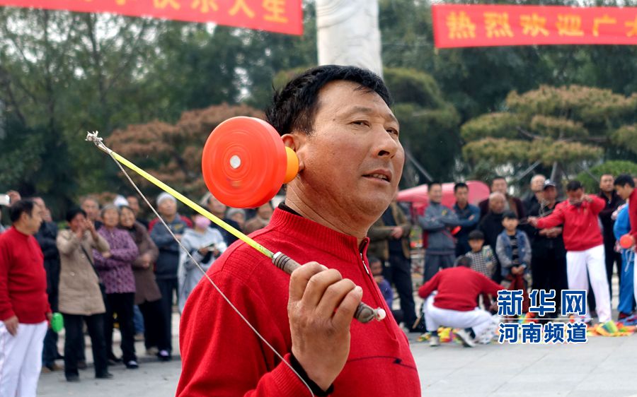 在河南省商丘市第六屆空竹文化節上,一位空竹愛好者在表演抖空竹技藝。