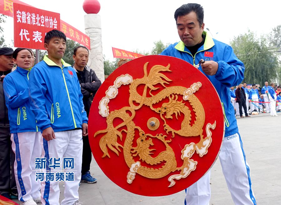來自安徽淮北市空竹協會代表隊的空竹愛好者在表演抖特大空竹技藝。