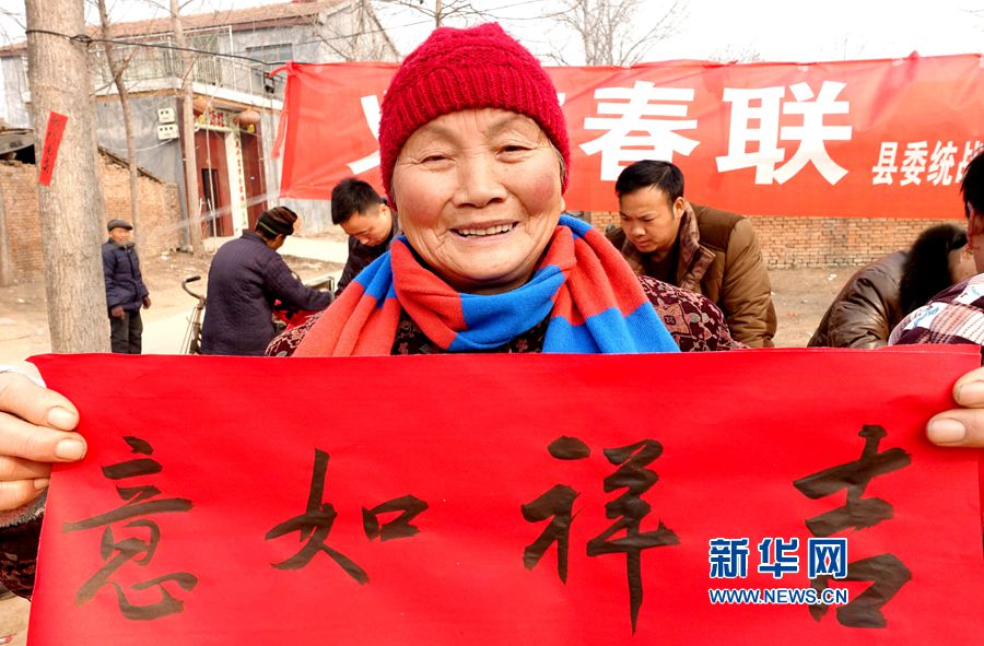 央廣網河南分網消息 春節臨近,河南省商丘市夏邑縣委統戰部組織部分夏邑籍中國書法家協會會員,來到該縣濟陽鎮濟北村,開展“義寫春聯迎新春”活動,書法家們為該村貧困戶及村民現場寫春聯,送春聯,把濃濃的節日祝福送給村民。新華網發 (苗育才攝)
