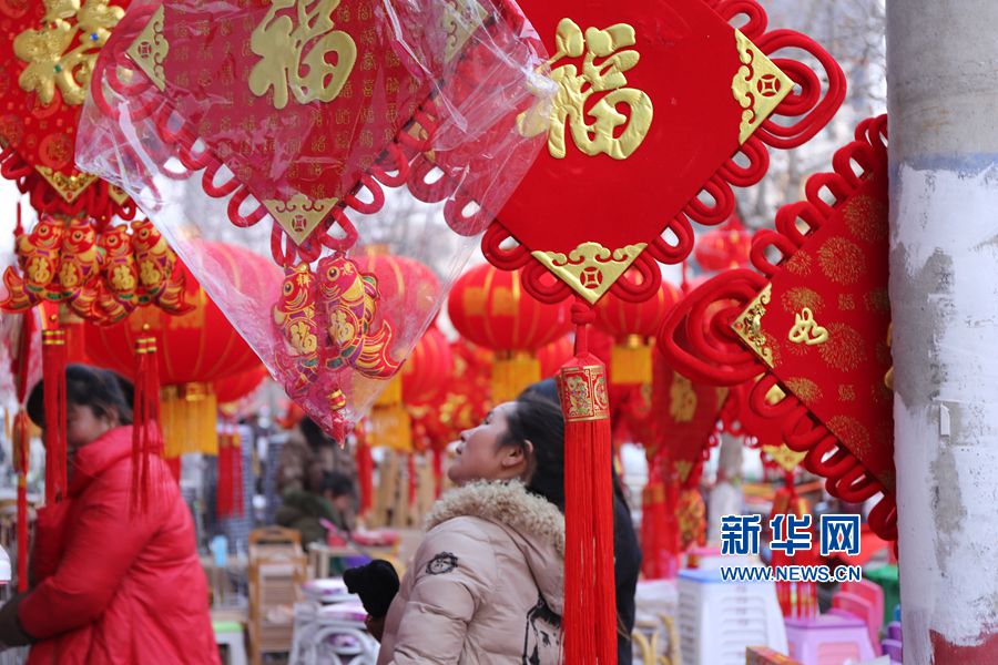 央廣網河南分網消息 2016年2月4日,河南省商丘市民權縣王橋鎮群眾在年貨市場挑選吉祥飾物。春節臨近,該縣年貨市場上的吉祥飾物生意異常火爆,大紅的燈籠、火紅的中國結和福字、成串的辣椒、金燦燦的元寶等預示著來年日子紅紅火火的各種吉祥飾物吸引群眾爭相購買。新華網發(馬玉 攝)