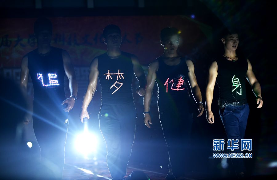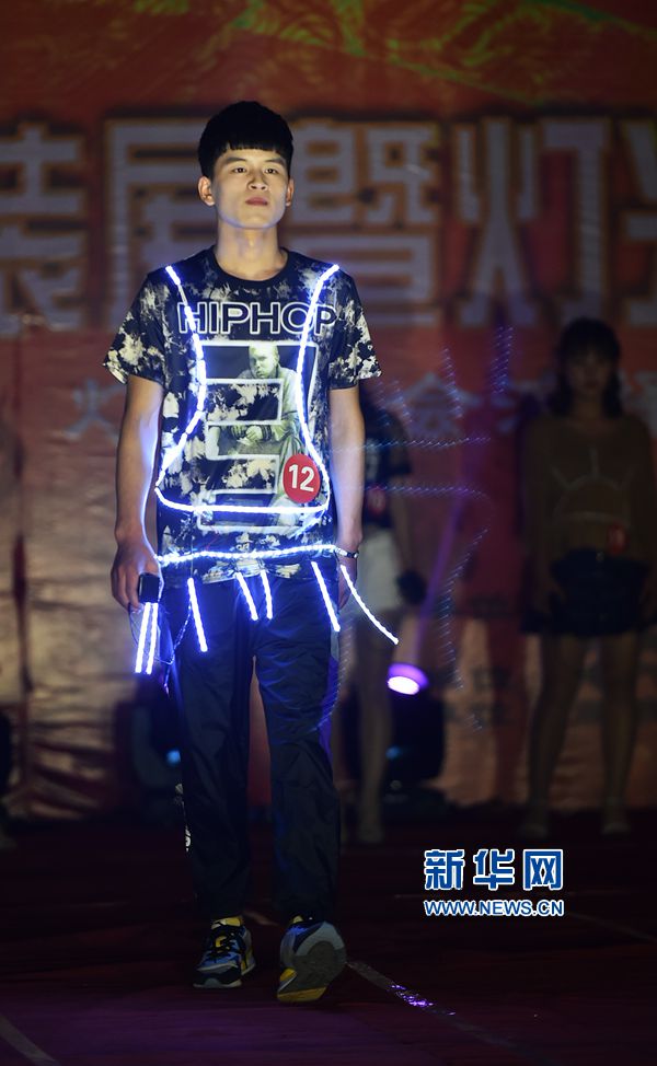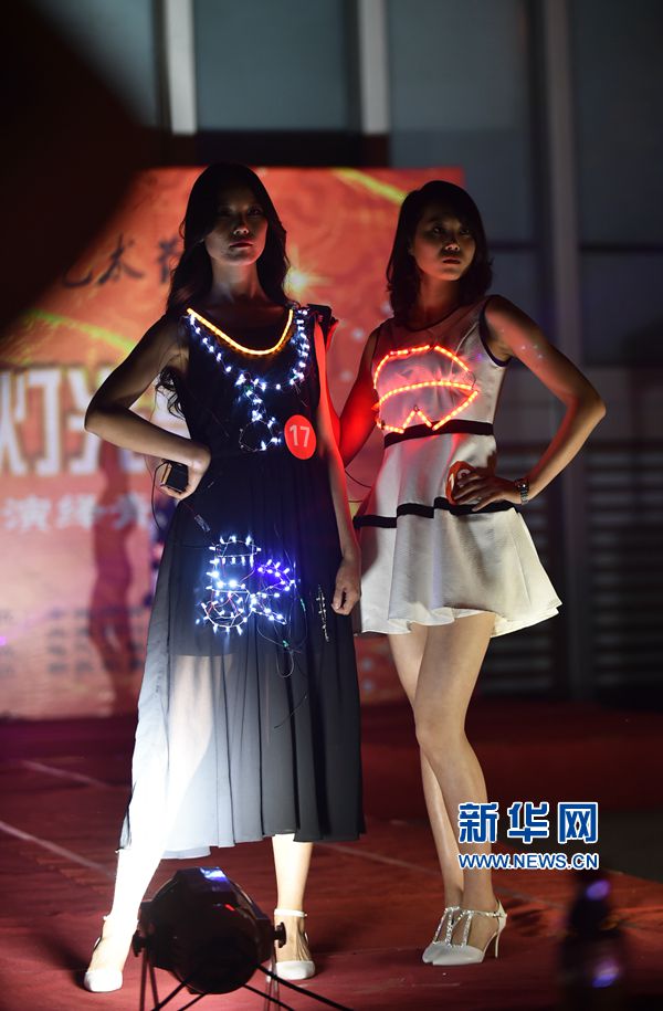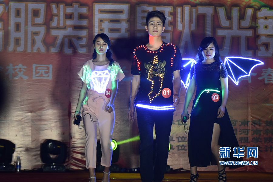 2016年5月21日晚,河南科技大學科技文化藝術節上,大學生自創的“電路服裝”T臺秀,創意十足。新華網發(黃政偉 攝)