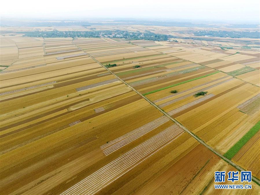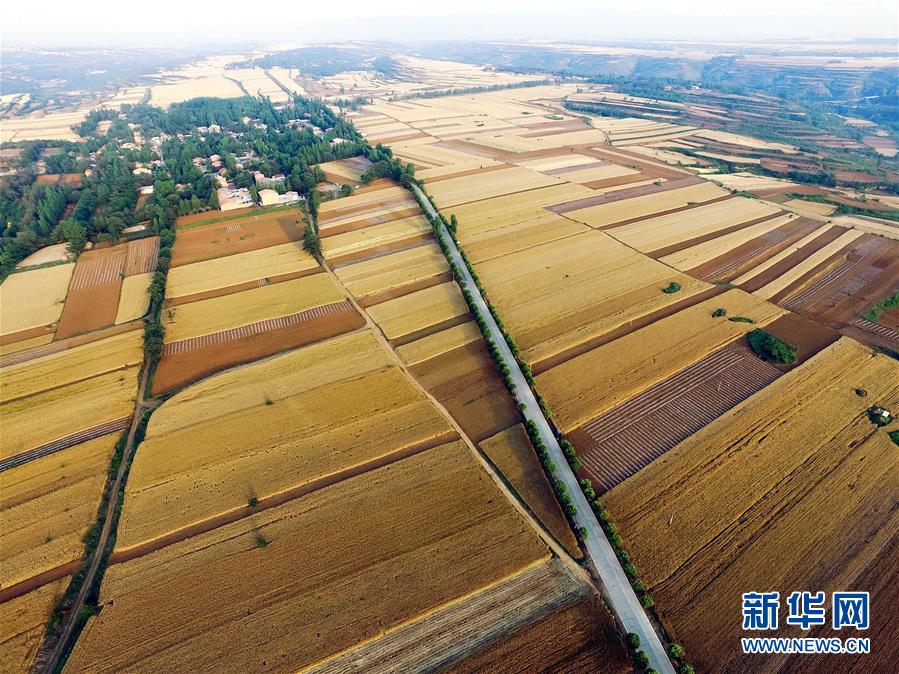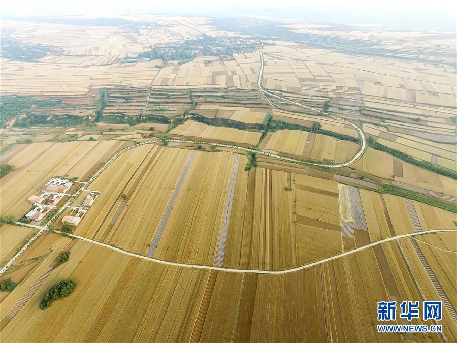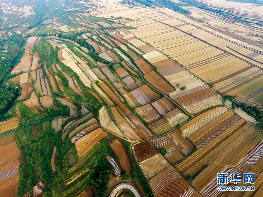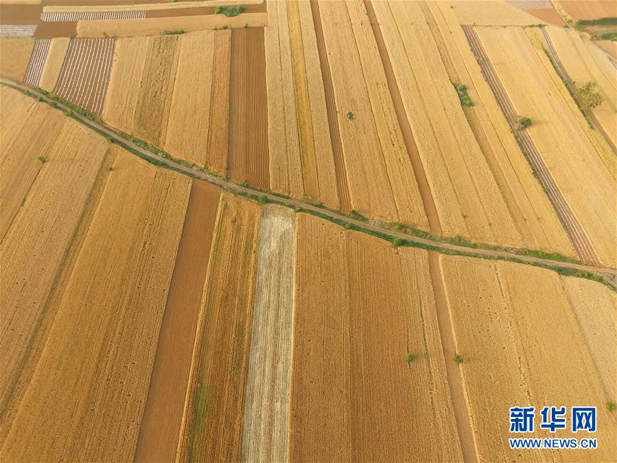 這是5月28日在河南省宜陽(yáng)縣三鄉(xiāng)鎮(zhèn)航拍的麥田。近日,河南省8100多萬(wàn)畝小麥自南向北陸續(xù)成熟,從空中俯瞰,麥田色彩斑斕,如美麗畫(huà)卷。今年三夏期間,河南省計(jì)劃組織400萬(wàn)臺(tái)以上農(nóng)業(yè)機(jī)械投入生產(chǎn),力爭(zhēng)小麥機(jī)收率達(dá)95%以上,玉米機(jī)播率達(dá)到91%。新華社發(fā)(田義偉 攝)